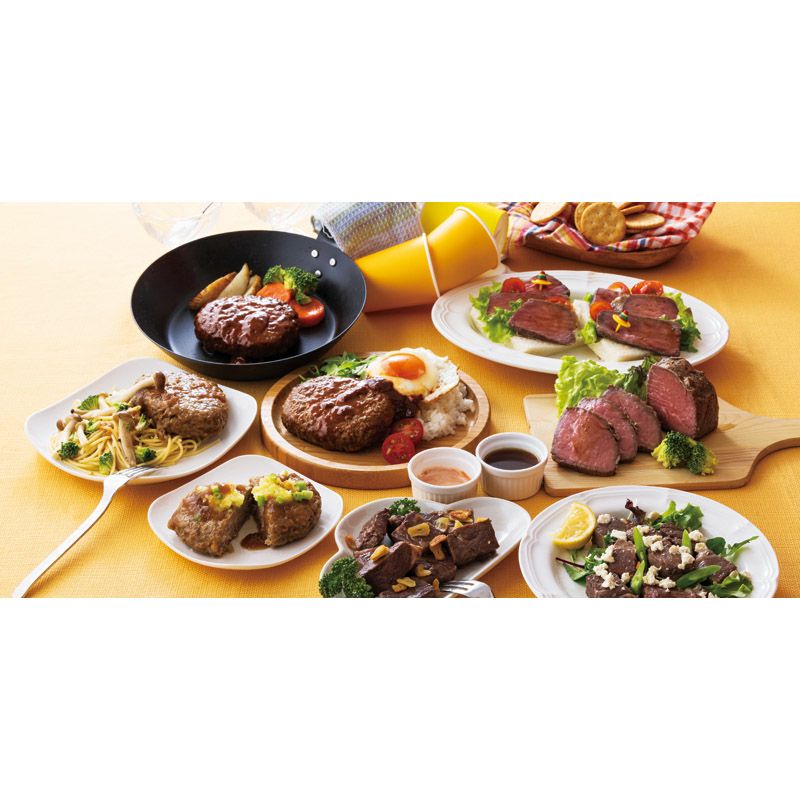 アンガス牛厚切り一口ステーキ(150g)・特製ステーキスパイス(2g)・アンガス牛ローストビーフ(150g)・濃厚デミグラスソースハンバーグ(160g)・淡路島産玉ねぎ和風ハンバーグ(160g)×各2、オリジナルソース(170g)×1