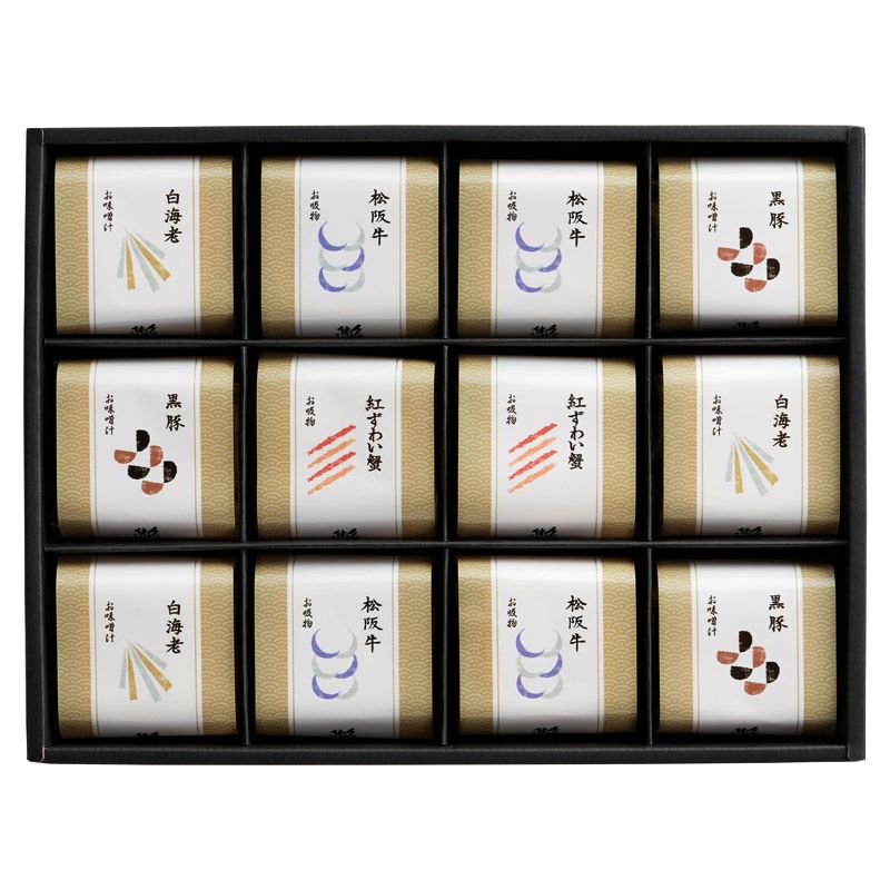 本格和風だしお吸物(松阪牛×4、紅ずわい蟹×2)、本格和風だしお味噌汁(黒豚・白海老×各3) ■アレルゲン:小麦・えび・かに