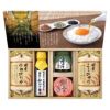 国産コシヒカリ(300g)・国産ゆめぴりか(300g)・飛騨高山蔵出し卵がけ?油(120ml)・小豆島で炊いた天然岩のり入り海苔佃煮(100g)・宇和海産鯛使用鯛みそ(100g)×各1