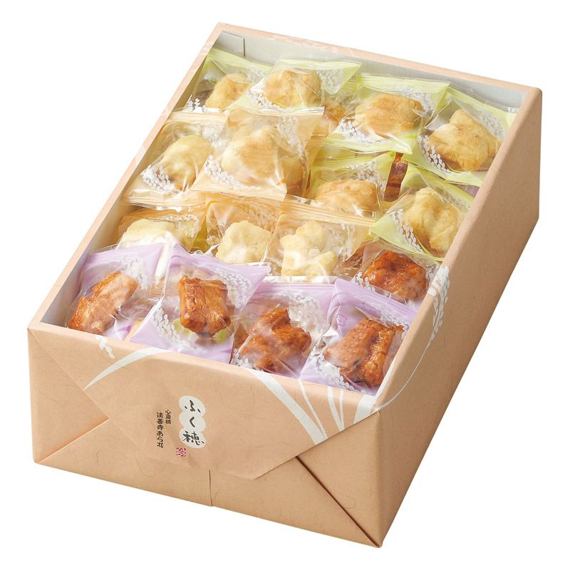 しっとりとした厚みでも、ふっくら、サクサクの「ふく穂」。その秘密は新技術のマイクロウェーブ加熱です。内部にも均等に火を通す焼き方なので、中までふっくらと焼きあげました。3種類のふんわりサクサクおかき詰合せギフトです。