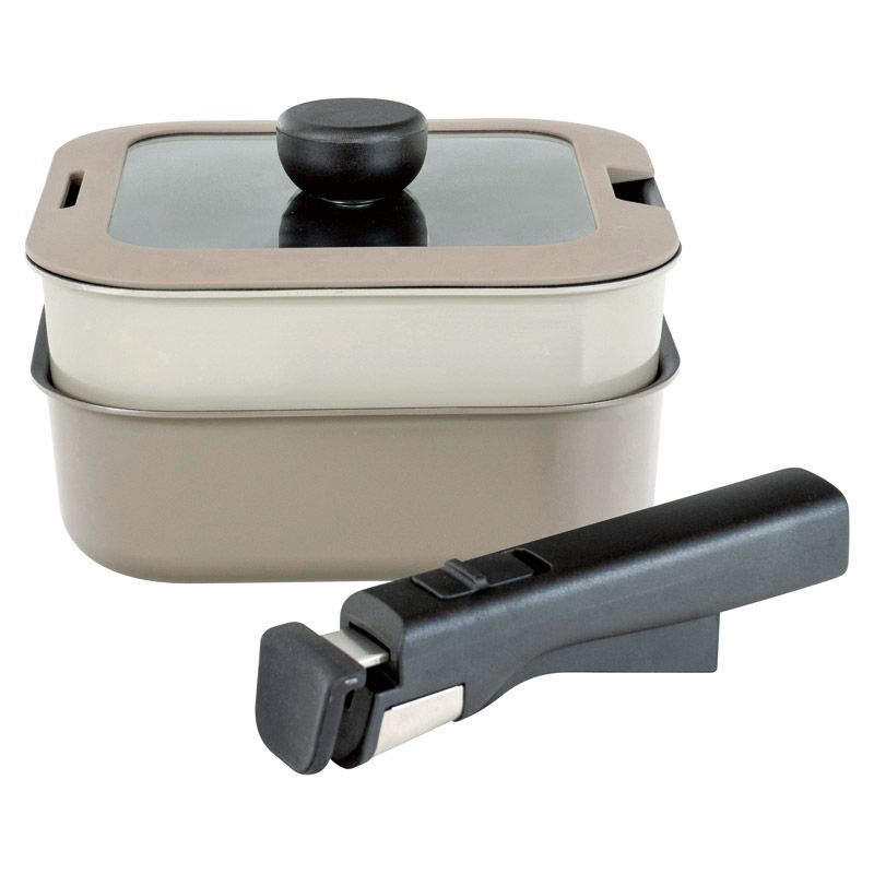 ハンドルが取れる四角いフライパン&鍋セット。スタッキングできるので収納場所を取りません。ハンドルが着脱式なのでオーブン調理も可能です。本体のみ食洗機OK。