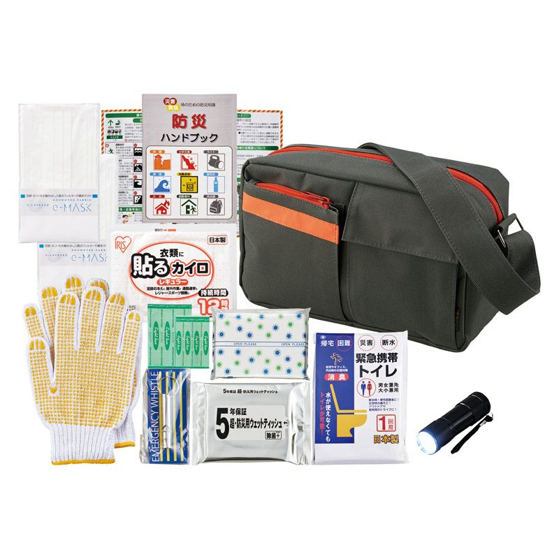 避難用ショルダーバッグ(約100×260×160mm)×1、9光ライト・ホイッスル・携帯トイレ(大小兼用)(1P)・ウェットティッシュ(20枚)・ポケットティッシュ・軍手・エイトバン(大小×各2)・使い捨てカイロ・防災ハンドブック×各1、マスク×2
