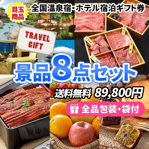全国温泉宿・ホテル宿泊券を目玉に大人気のグルメを含めた盛り上がり景品8点セット