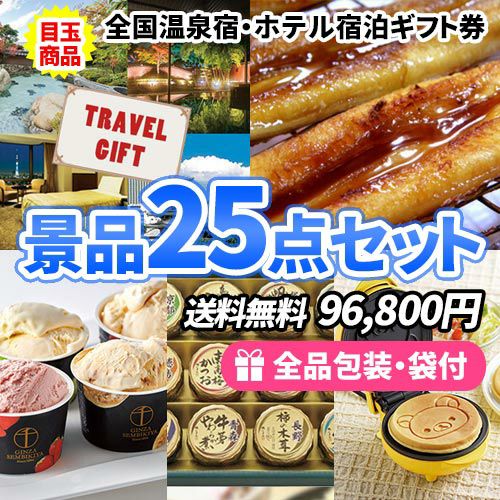 全国温泉宿・ホテル宿泊券がメインの多人数に対応できる景品25点セット