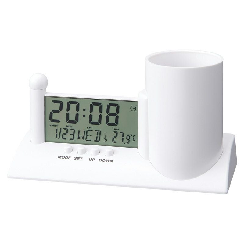 便利なペンホルダー付の多機能マルチクロックです。○時計○アラーム○スヌーズ○カレンダー温度計○カウントダウンタイマー○誕生日お知らせ