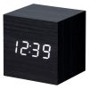 時計、アラーム、温度湿度、カレンダー、12/24時間切替等、多機能なキューブ型デザインの時計です。乾電池(別売)、給電のどちらでもご使用頂けます。音感感知も可能。