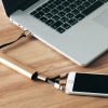 デバイスに応じて、3種類を使い分けしていただくスティック型ケーブルです。入力:USB-A、出力:TYPE-C、iPhone用コネクタ、Micro USB(最大出力 2.1A)。3個同時充電・給電可能。ケーブル全長約310mm。
