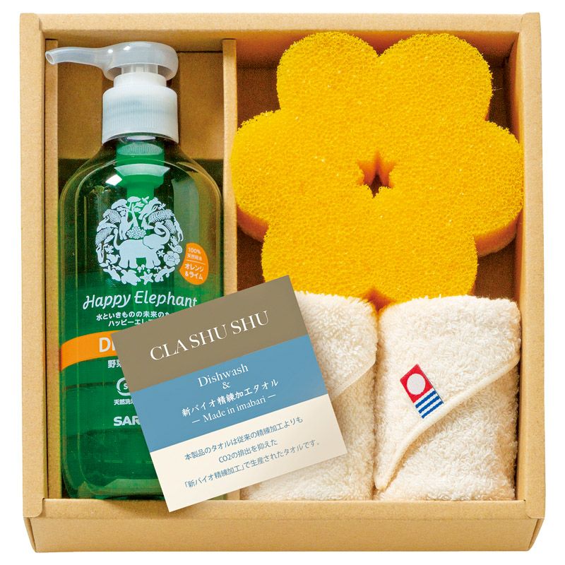 植物と酵母から生まれた未来の洗剤”Happy Elephant”と、従来の精練加工よりもCO2排出削減を実現した無添加のやさしいファブリックのセットです。