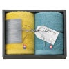 トレンドカラーのタオルとおしゃれなチャコールグレイの箱の組み合わせが洗練された印象を与える、モダンな雰囲気のタオルギフト。