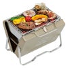 本体(使用時:約300×220×230mm/収納時:約300×240×70mm)・目皿フレーム・目皿(燃料用)・バーベキュー網×各1 ■材質:鉄(焼付塗装)・ステンレス銅・アルミニウム合金・鉄(クロムメッキ)