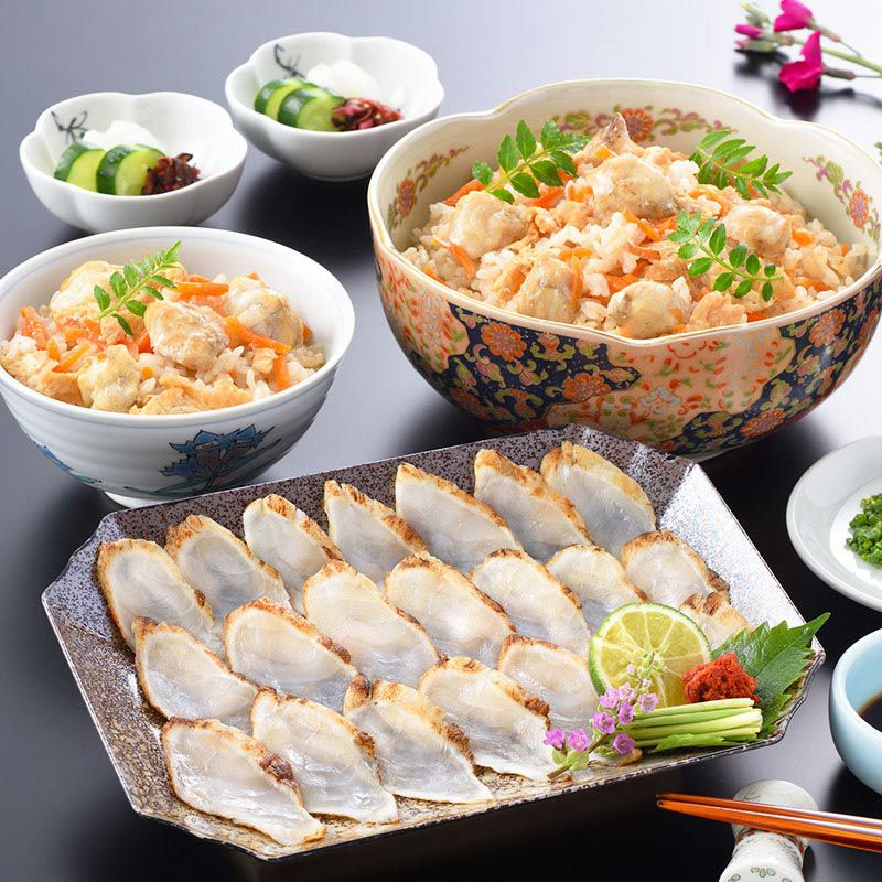 料亭の上品な出汁とたっぷりの具材で、贅沢な炊き込みごはんが手軽に作れます。天然真ふくの表面をこんがりと炙り、丁寧におろした「たたき刺し」は、ふく刺しとはひと味違った食感、味わいをお楽しみいただけます。