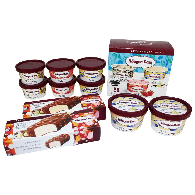 ミニカップ(バニラ)110ml・バー(バニラチョコレートマカデミア)80ml×各2、ラバーズアソート(バニラ・ストロベリー・クッキー&クリーム各70ml×2)×1 ■アレルギー:卵・乳・小麦