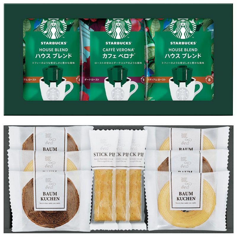 スターバックスオリガミドリップコーヒー(ハウスブレンド)×3、スターバックスオリガミドリップコーヒー(カフェベロナ)×2、バウムクーヘン(ココア・バニラ)・スティックパイ(プレーン)×各3 ■アレルギー:卵・乳・小麦