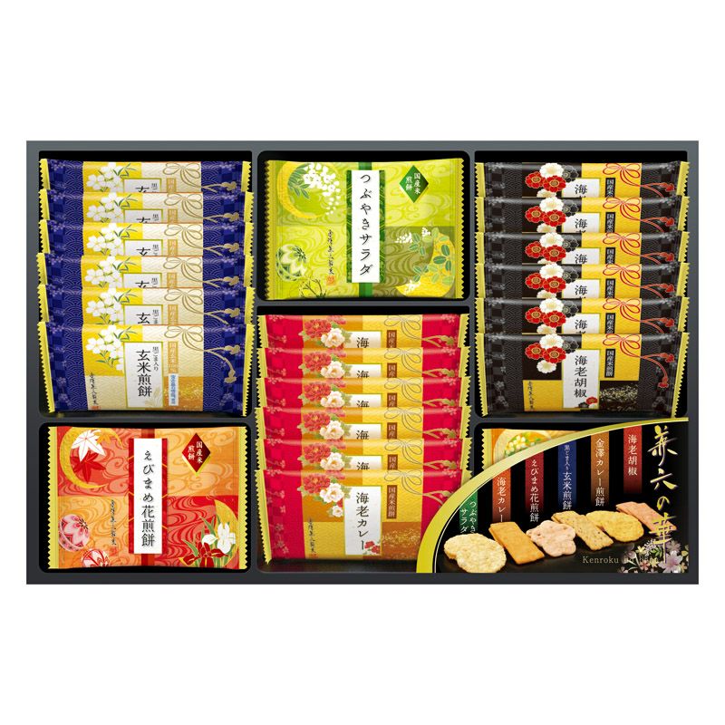 海老カレー煎餅・黒ごま入り玄米煎餅・海老胡椒煎餅×各6、えびまめ花煎餅・つぶやきサラダ煎餅・金澤カレー煎餅×各3
