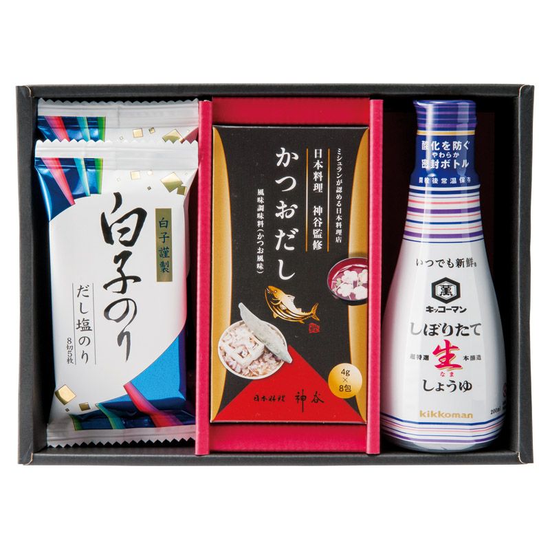キッコーマンしぼりたて生醤油(200ml)・かつおだし(4g×8袋)×各1、白子だし塩のり(8切5枚)×2