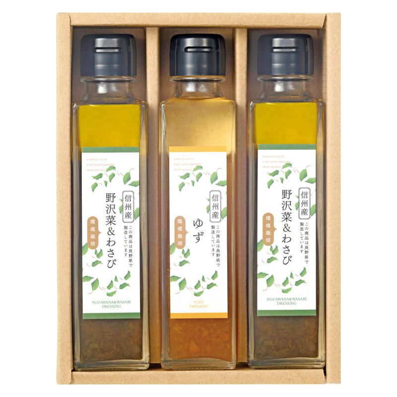 野沢菜&わさびドレッシング(150ml)×2、ゆずドレッシング(150ml)×1