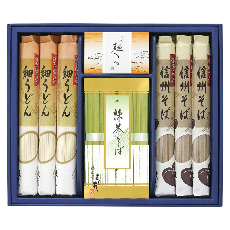 風味の良い信州そば、やや細めに仕上げたのど越しの良い細うどん、香り豊かな抹茶そばを詰合せにしました。
