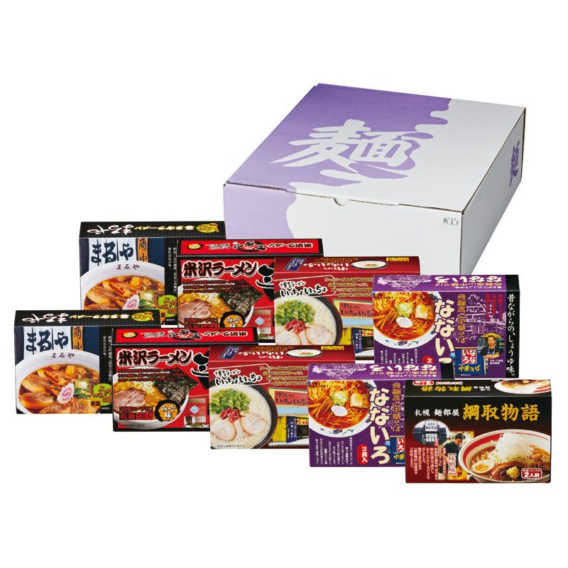喜多方ラーメン「まるや」醤油味(2食入)(220g)・米沢ラーメン「三男坊」味噌味(2食入)(268g)・博多ラーメン「いっちょいっちょ」豚骨味(2食入)(230g)・飛騨高山中華そば「なないろ」(2食入)(250g)×各2、北海道札幌ラーメン「綱取物語」味噌味(2食入)(288g)×1
