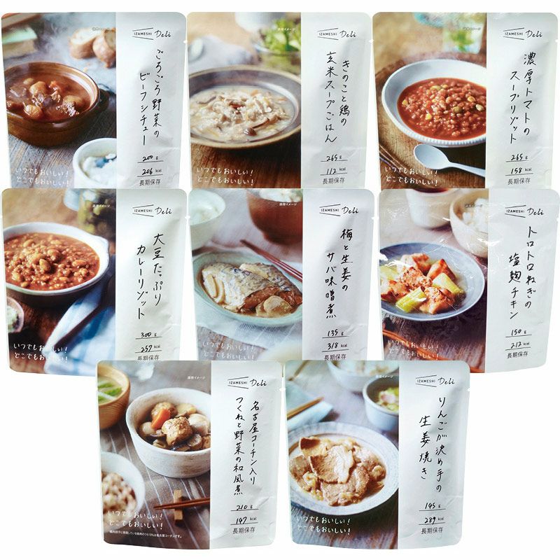 大豆たっぷりカレーリゾット(300g)・きのこと鶏の玄米スープごはん・濃厚トマトのスープリゾット(各265g)・名古屋コーチン入りつくねと野菜の和風煮(210g)・ごろごろ野菜のビーフシチュー(200g)・トロトロねぎの塩麹チキン(150g)・りんごが決め手の生姜焼き(145g)・梅と生姜のサバ味噌煮(135g)×各1 ■賞味期限:3年 ★紙皿×2、スプーン×4付 ■アレルゲン:卵・乳・小麦