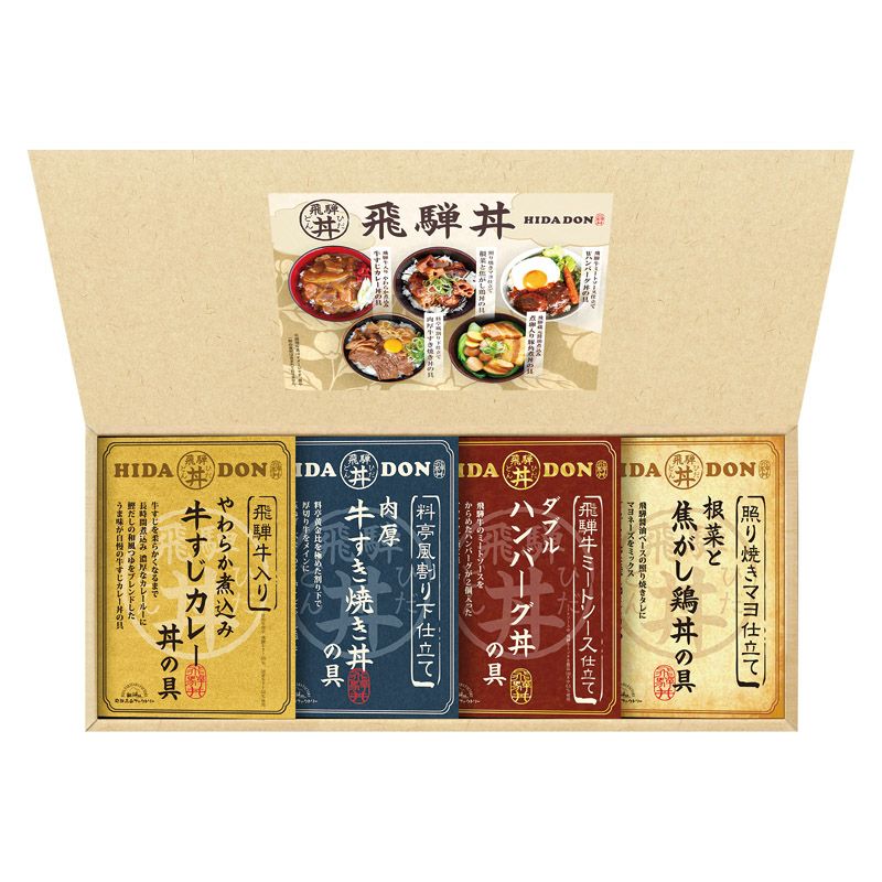 飛騨牛仕込み牛すじカレー丼の具(180g)・照り焼きマヨ仕立て根菜と焦がし鶏丼の具(160g)・料亭風割り下仕立て牛すき焼き丼の具(170g)・飛騨牛ミートソース仕立てWハンバーグ丼の具(180g)×各1